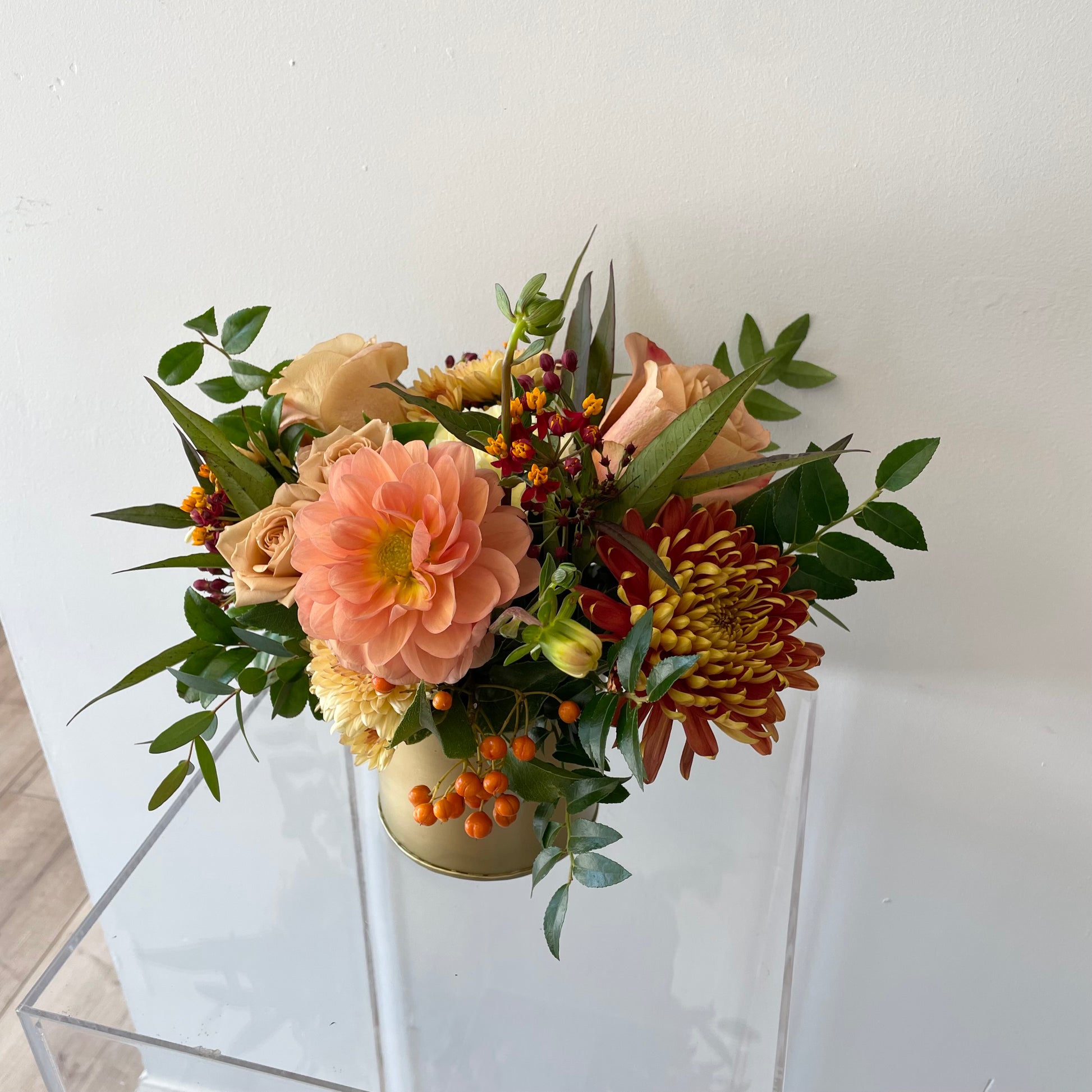 Inspired by the seasonal colours and textures Autumn brings. Colour palette may vary slightly but will remain inspired by the season. Designed gold glass vase.