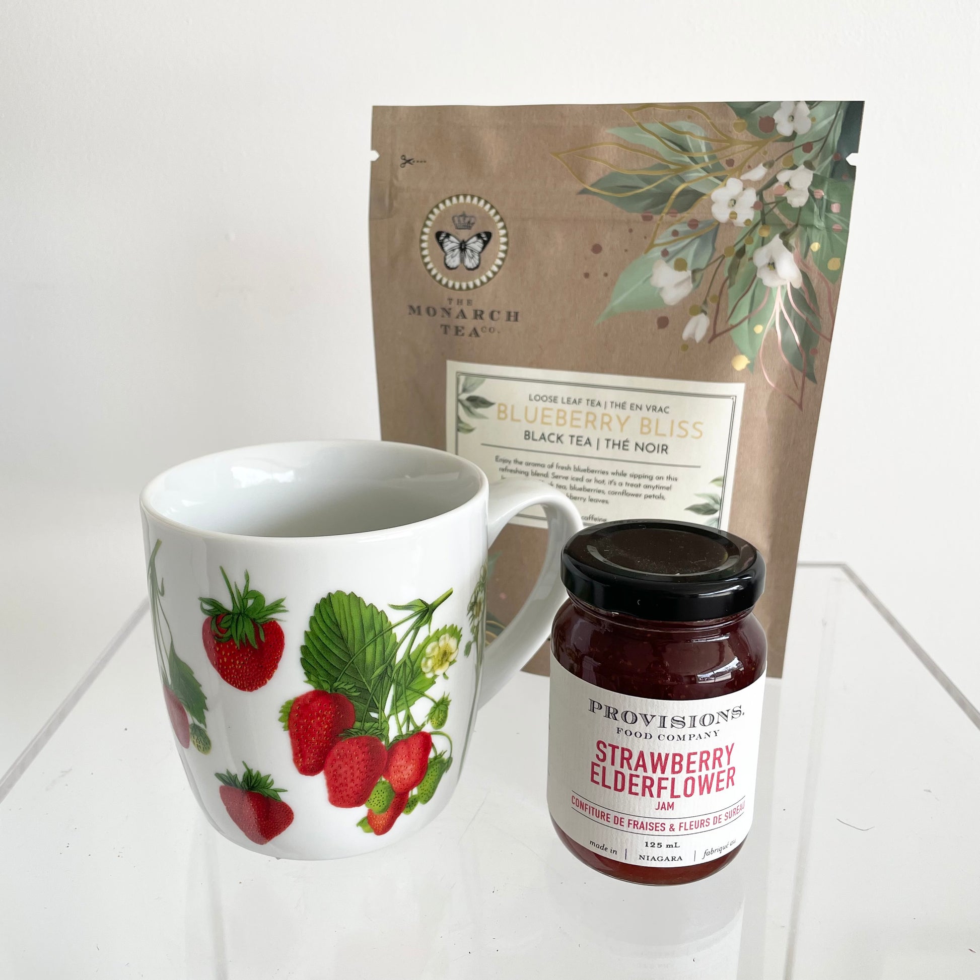 Includes a strawberry mug, strawberry elderflower jam and tea.