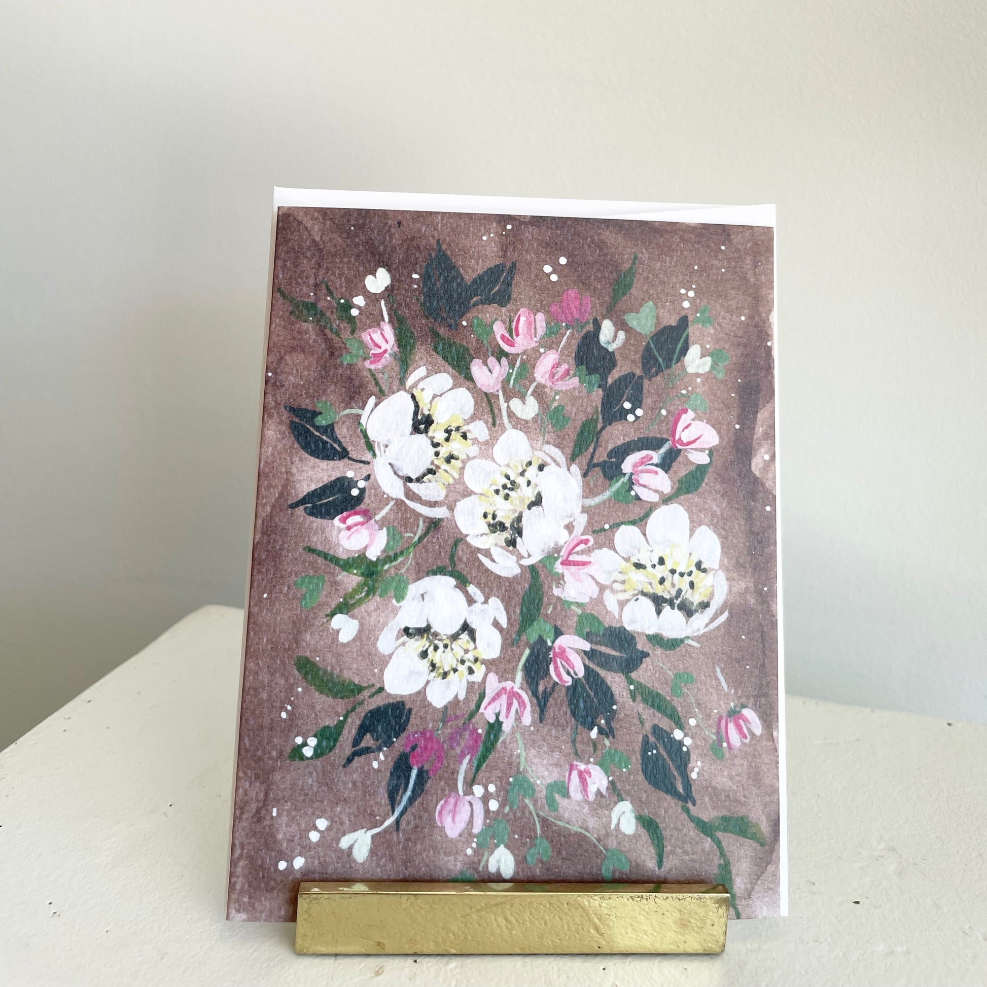 Floral illustration on brown background. Blank inside. Painted and printed in Ontario.