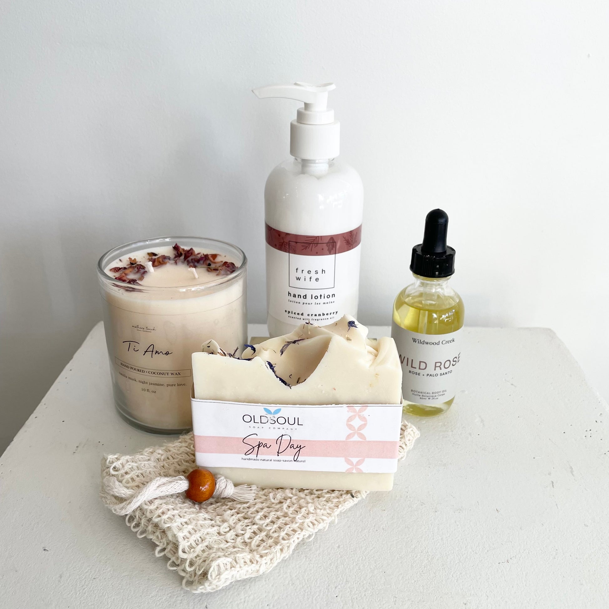 Large hand poured soy and coconut candle, hand lotion, body and bath oil, hand crafted soap and soap saver pouch.