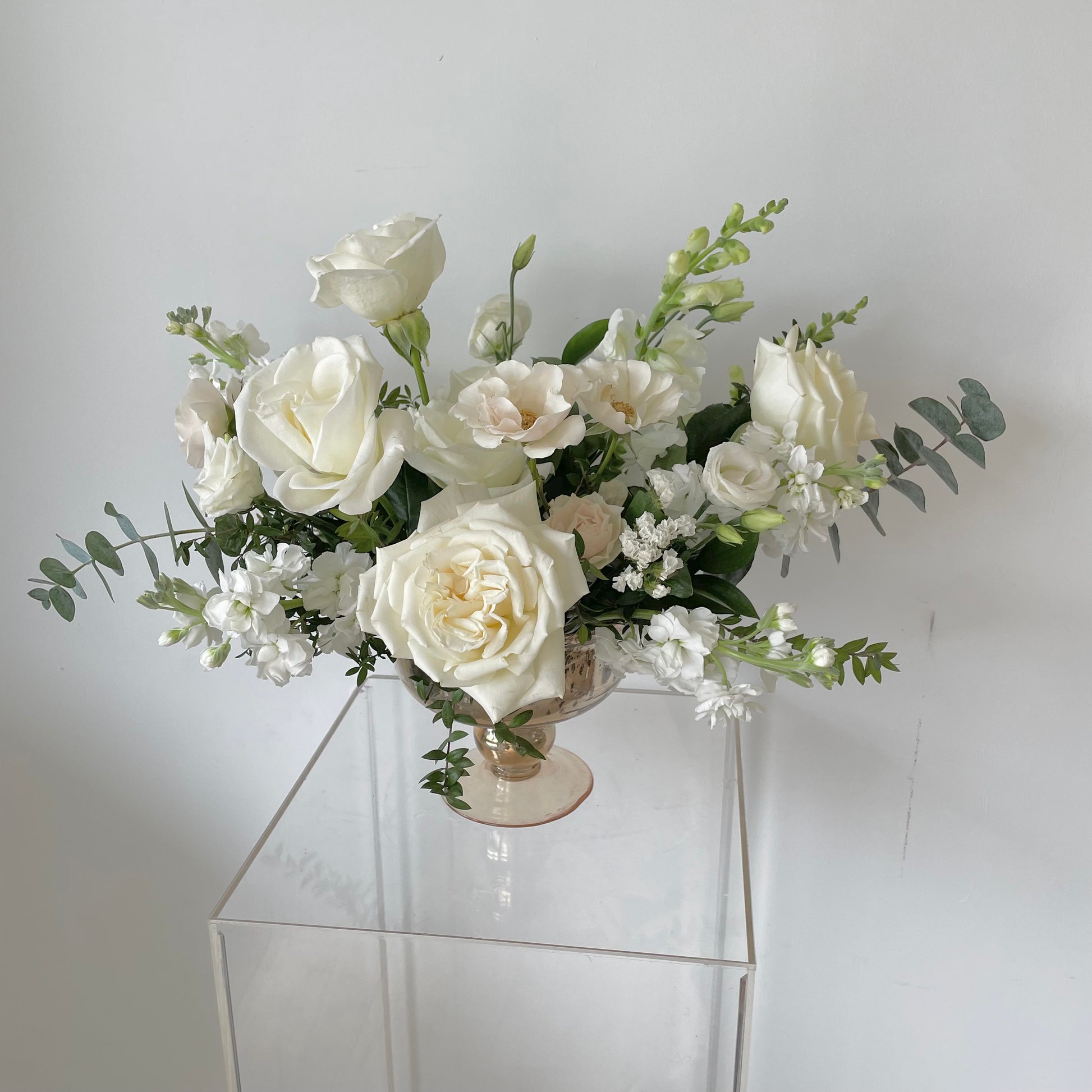 Lush garden style arrangement in choice of silver or gold mercury glass vase. This arrangement could work at a ceremony signing table or placed ontop of wine barrels. It would also work at reception dinner as a larger centrepiece.