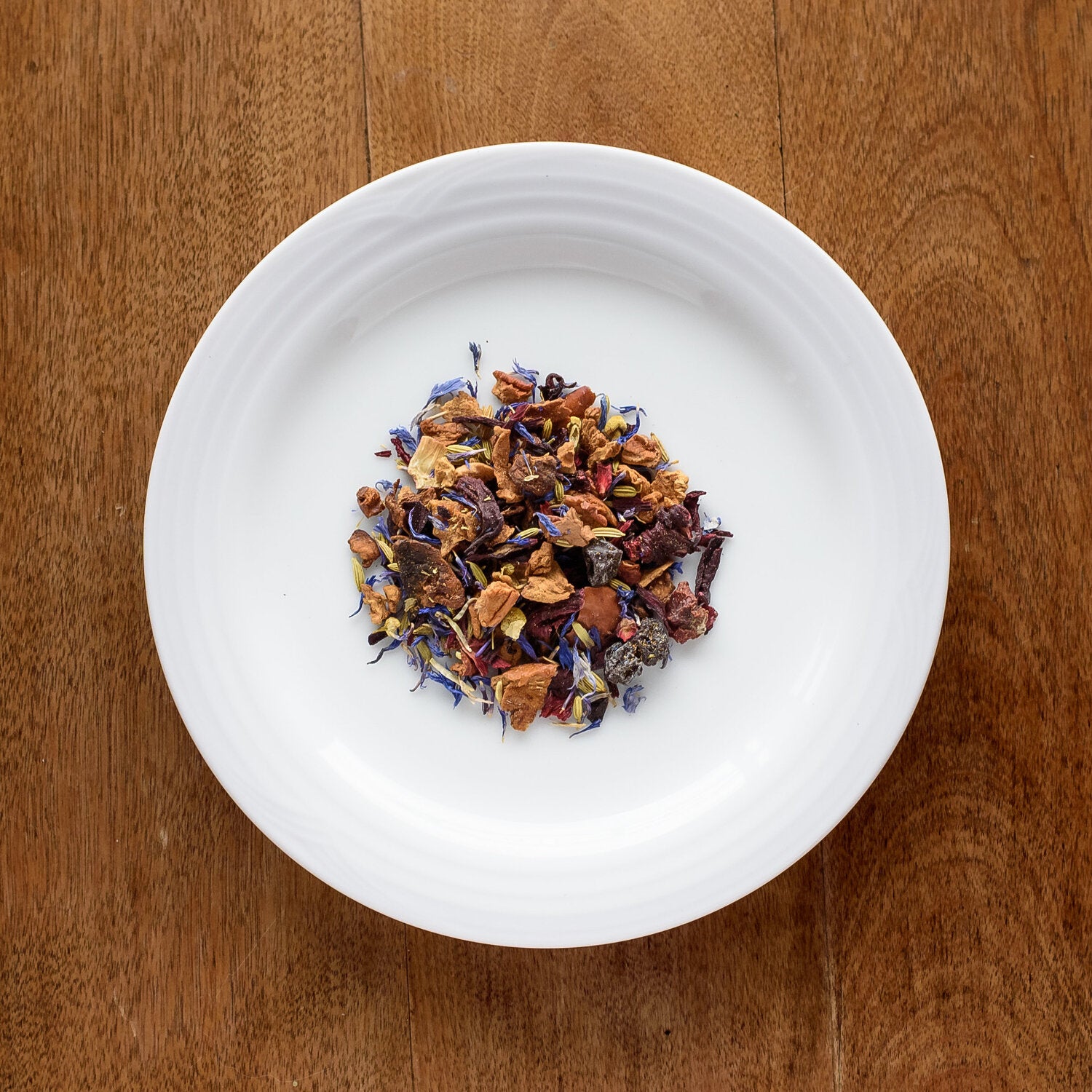 Rich in vitamin A, C and beta-carotene, this hibiscus based blend is caffeine free and a great kid-friendly option. Perfect for licorice lovers, this fruity tisane has notes of honey and fennel. It can provide relief from sore throats, coughs and colds. Ingredients: dried apple, rosehip pieces, hibiscus petals, fennel, dried currants, cornflower petals, natural flavours.