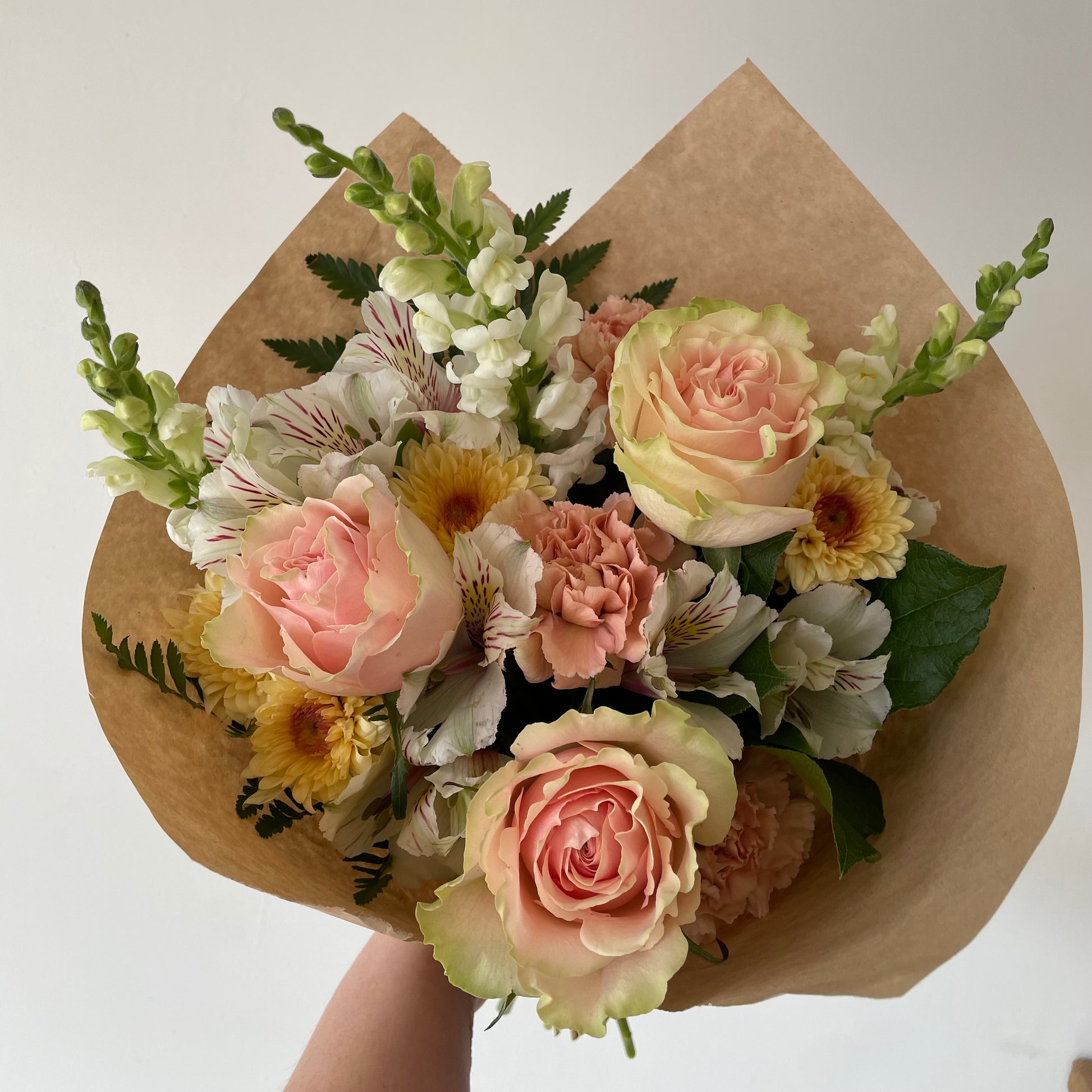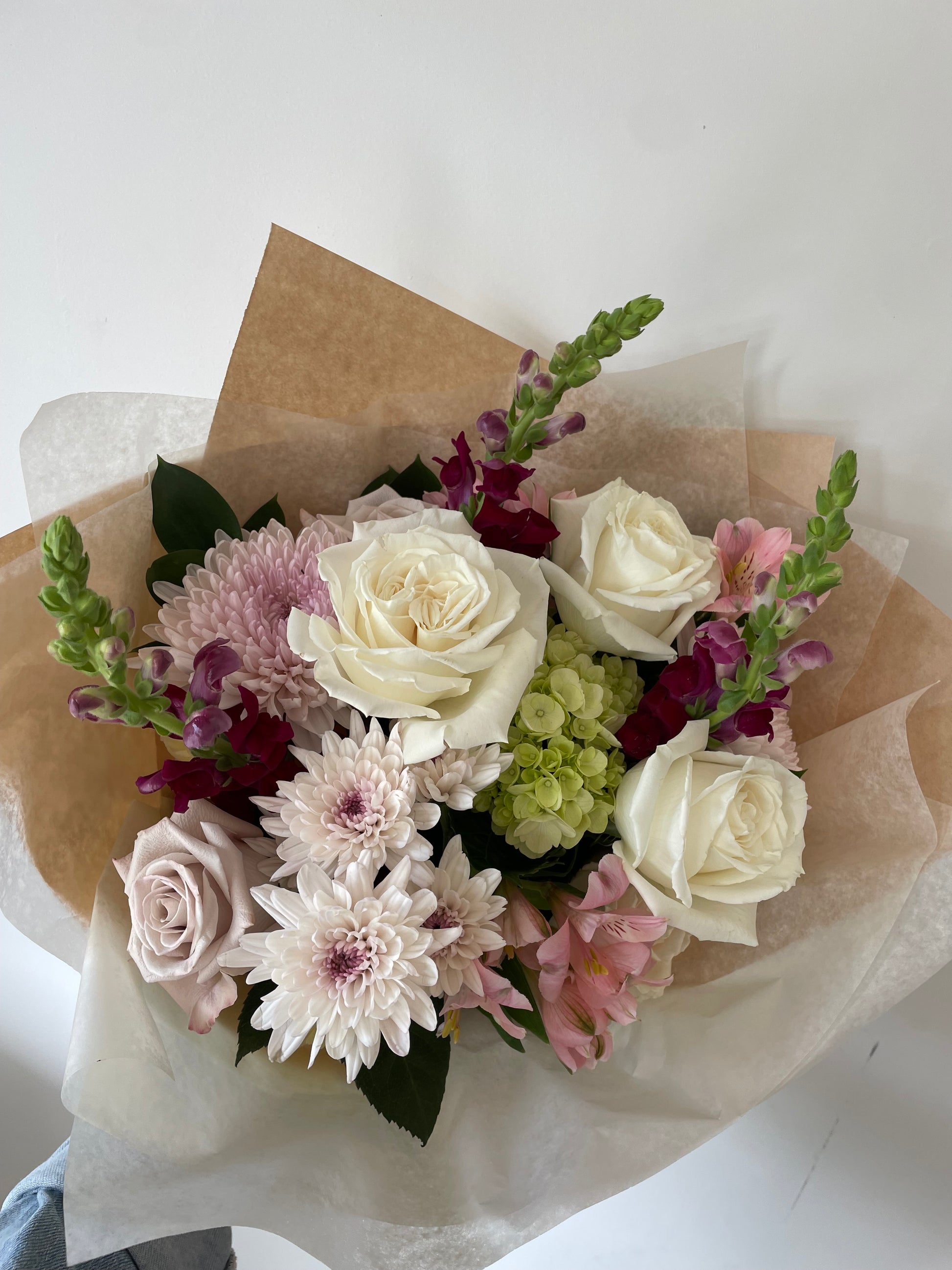 Designer’s choice hand tied bouquet featuring a variety of fresh blooms and greenery. Colour will vary weekly based on flowers of the week. For any questions please call the shop.