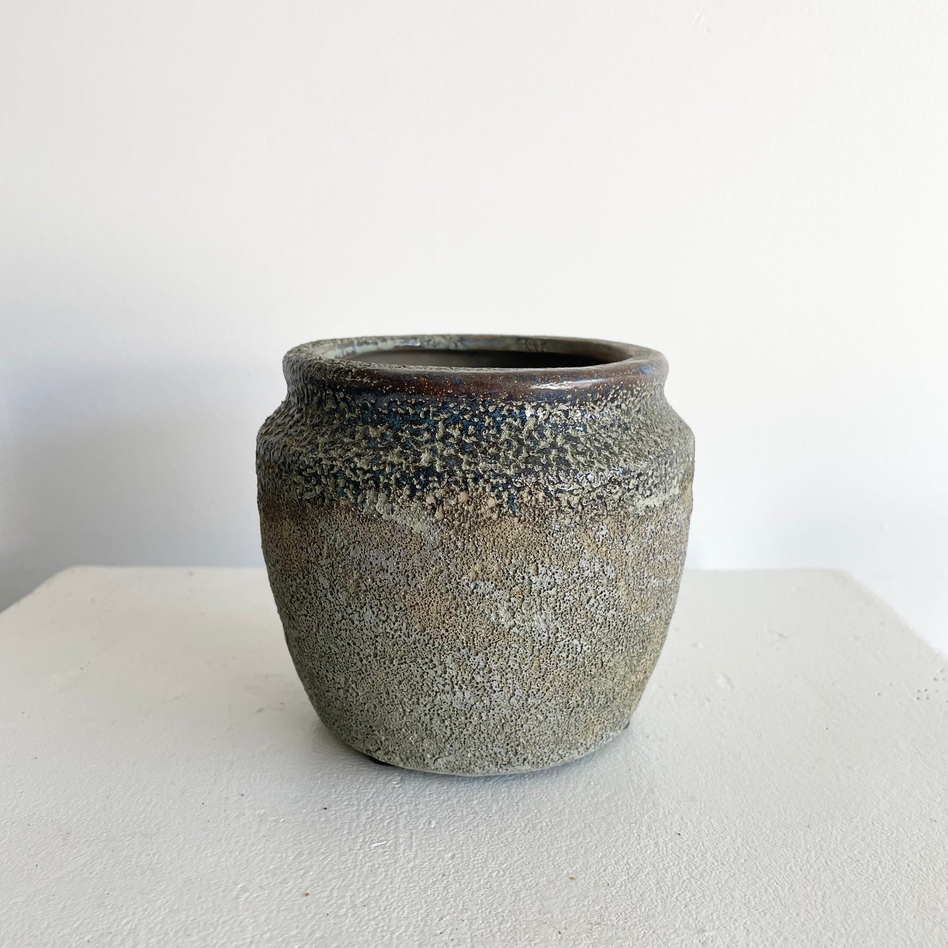 Stoneware pot with subtle grey blue speckled glazing around the top and subdued moss green bottom