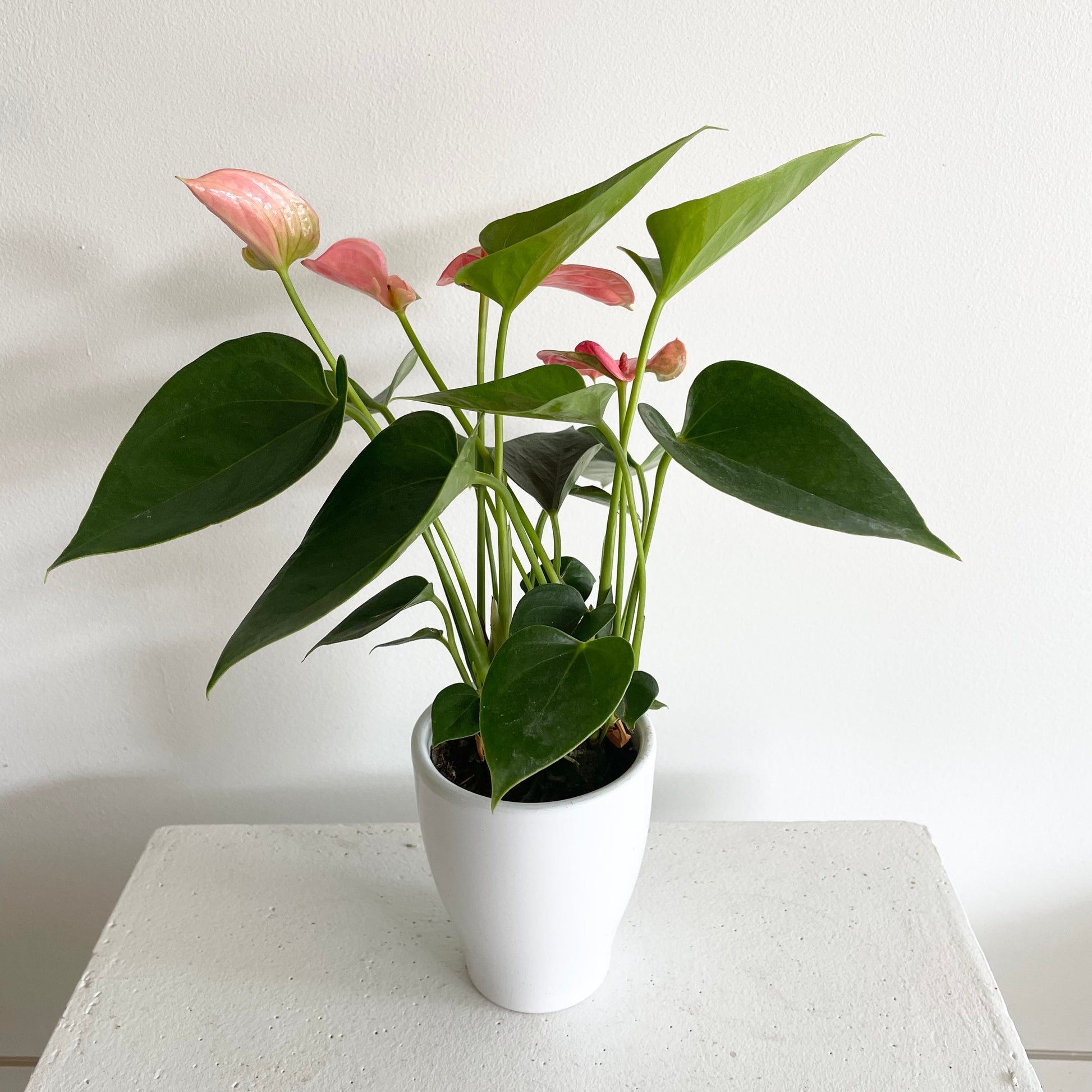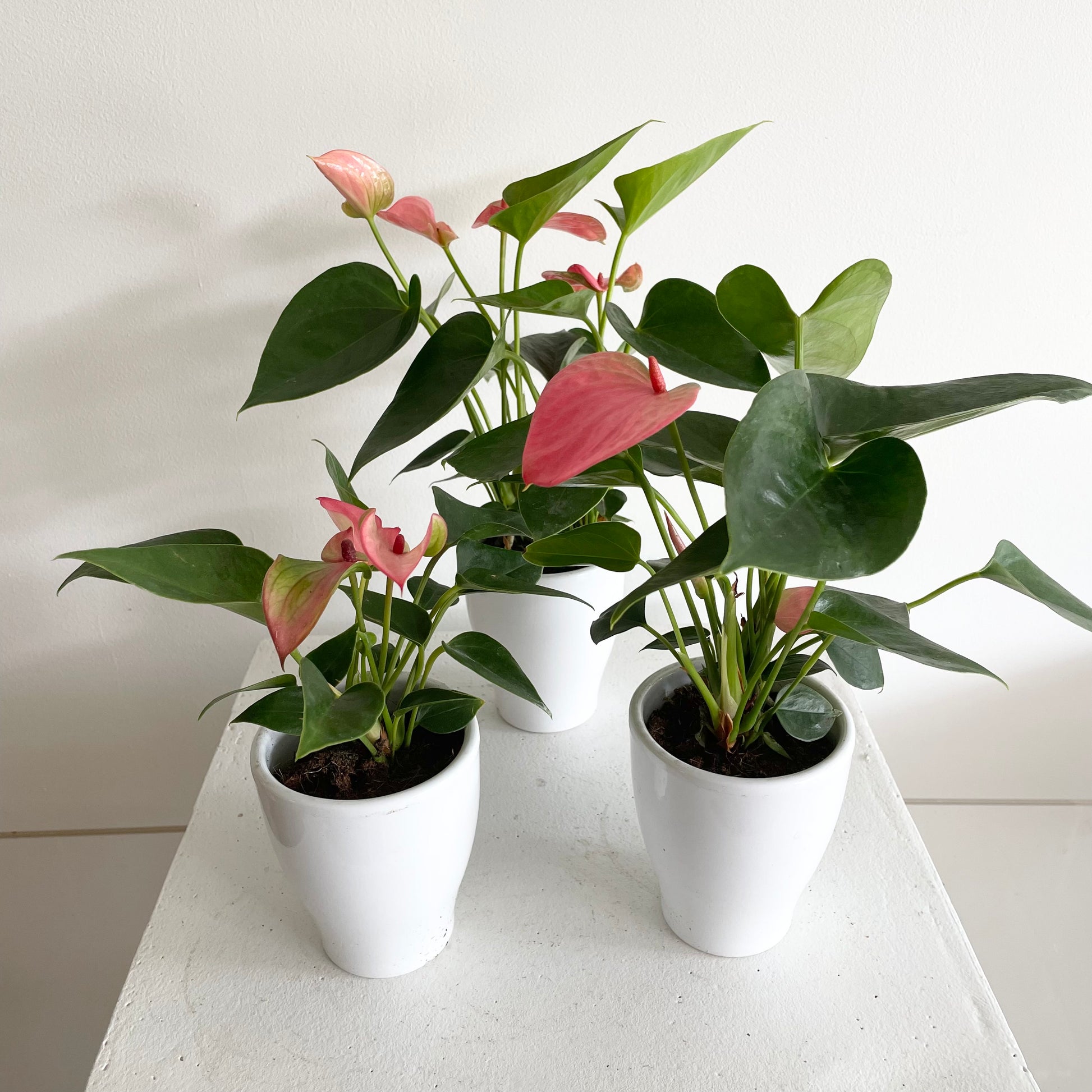 Mini peach Anthirium in white ceramic 4” pots. Each sold separately.