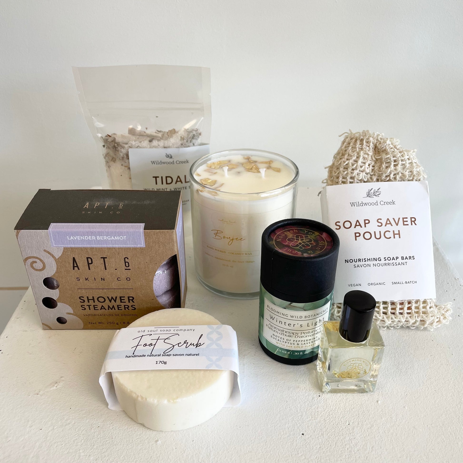 This curated gift box includes a collection of items to create a luxurious spa experience at home. Hand poured coconut wax blend candle, all natural bath soak, shower steamers, aromatherapy roll-on fragrance, exfoliating soap saver pouch and organic soap, foot scrub. Ready to gift in box and wrapped with cellophane.