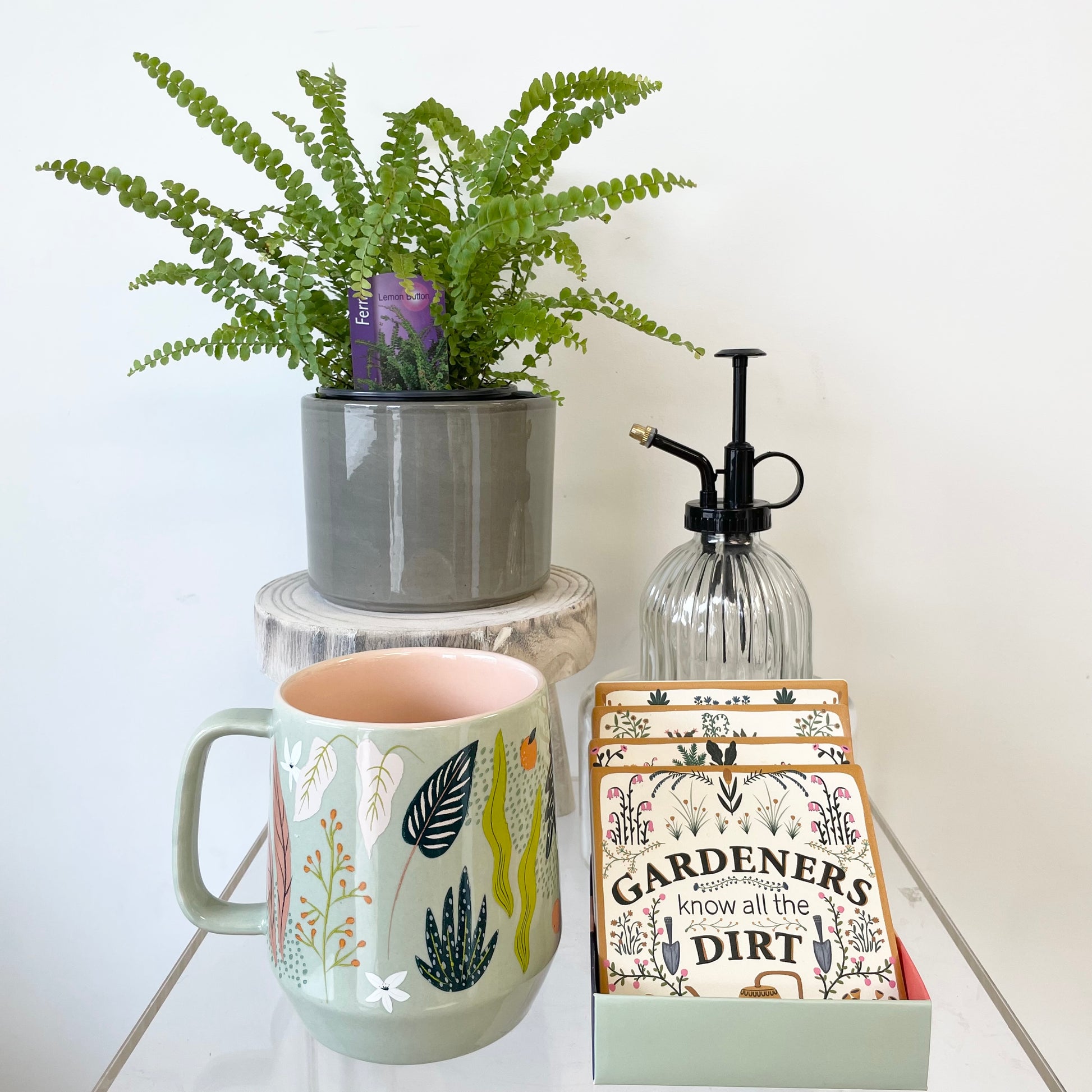 Fern or tropical plant in ceramic pot, set of 4 coasters, plant spritzer, and plant mug