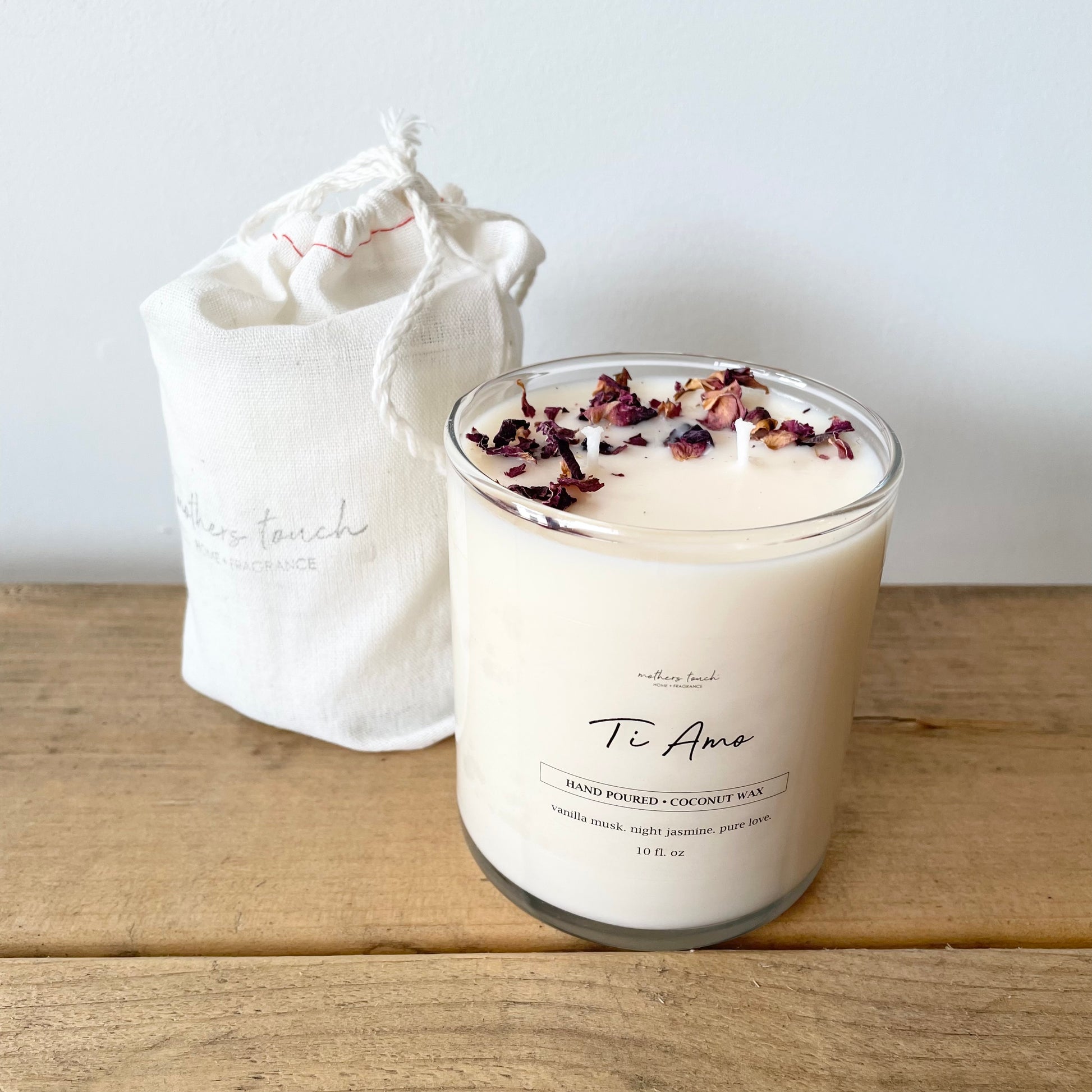 With a base of our vanilla blend, and the prettiest notes of Night Jasmine and Magnolia, you can’t go wrong. There are double cotton/hemp wicks to symbolize love. To finish it off, we sprinkle dried, homegrown rose petals on top.