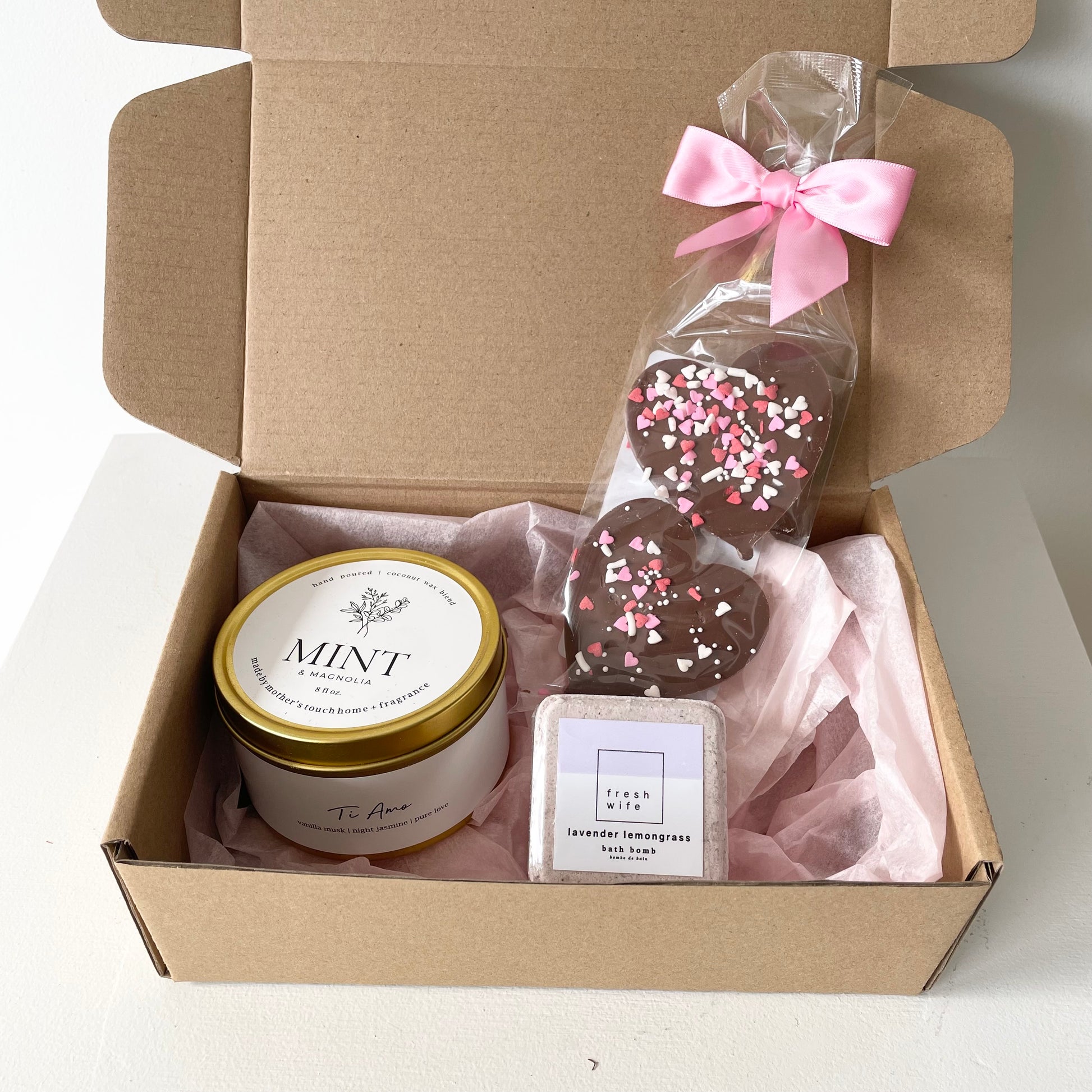 Curated gift boxes perfect for celebrating someone you love. All products are handmade in Canada by small companies. Soap, bath soak, lip balm, coconut wax candle, milk chocolate